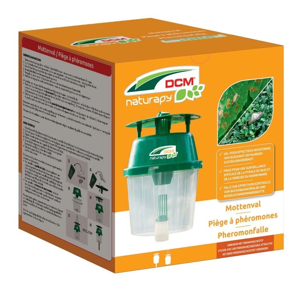 DCM Mottenval is een unieke val speciaal ontworpen om, in combinatie met het juiste DCM feromoon, specifieke motten te vangen voor monitoring, bv. de buxusmot of paardenkastanjemineermot. Deze val is snel en eenvoudig monteerbaar en is dankzij zijn robuust en weersbestendig ontwerp verschillende jaren bruikbaar.