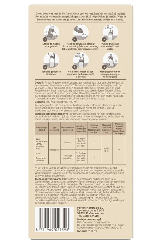Pokon Tegen Onkruid Concentraat bestrijdt snel en effectief alle bovengrondse delen van het onkruid. De eerste effecten zijn zichtbaar binnen 3 uur. De werkzame stof wordt snel afgebroken in de bodem. Pokon Tegen Onkruid Concentraat kan het hele jaar gebruikt worden, bij een minimumtemperatuur van 15 graden Celsius. Behandel mos alleen in het najaar en in het voorjaar. Gebruik dit middel op een dag met zacht weer, zonder regen en wind. Regen binnen 3 uur na toepassing kan de werking verminderen. Gebruik bij het toepassen een drukspuit en geen gieter. Bevochtig enkel de onkruiden en voorkom dat het middel van de onkruiden afdruipt. Niet mengen met een ander herbicide.