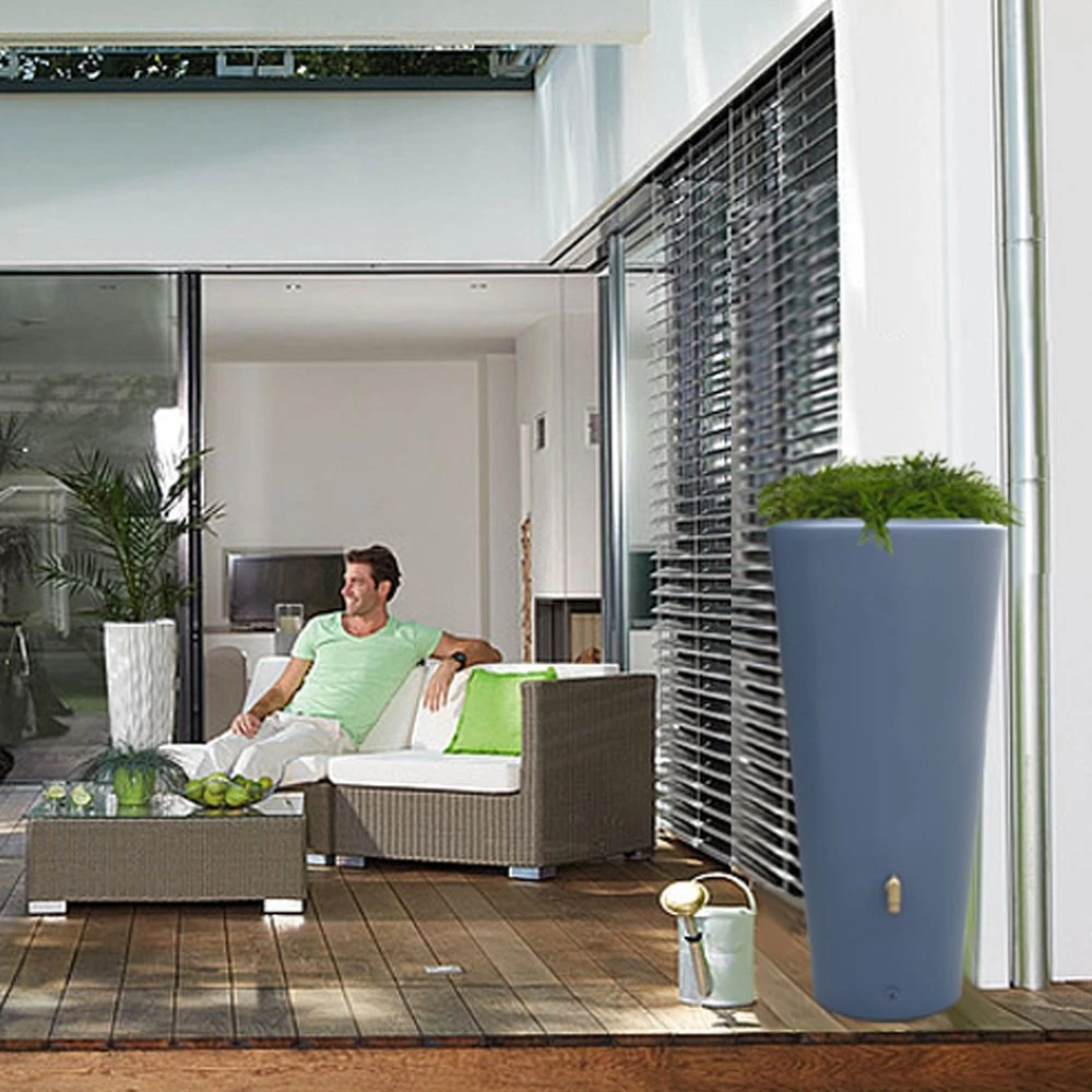 Moderne 2in1 regenton van 220 liter met de mogelijkheid bovenin planten te plaatsen.